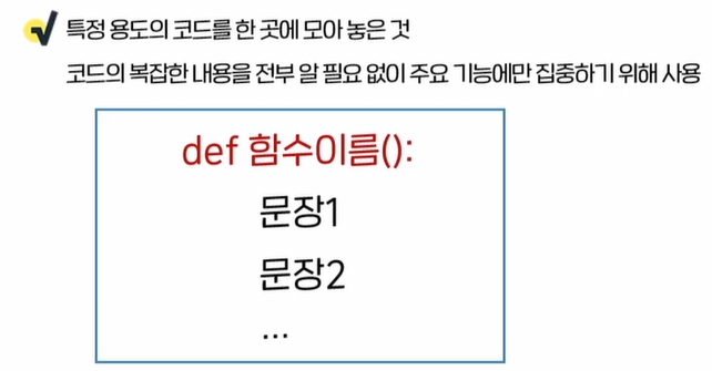 함수의 시작에 :와 들여쓰기(tab)를 꼭 지켜줘야 된다. 파이썬에선 들여쓰기를 무시하면 안된다!