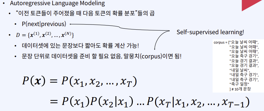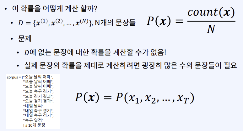 조건부 확률을 활용하여 좀 더 짧은 문장에 대한 확률도 구할 수 있게 된다. P(오늘)P(날씨|오늘) 이렇게 볼 수 있다.
