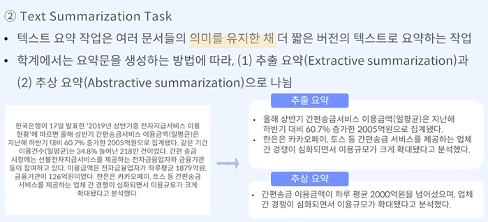 추상요약 - 문장을 사람이 요약하듯 요약 -> 문장 전체를 원문에 없는 문장으로 만들기