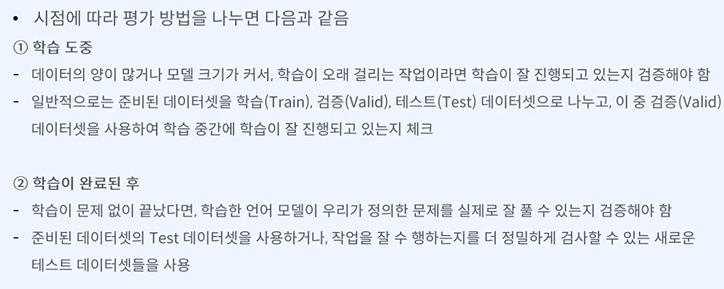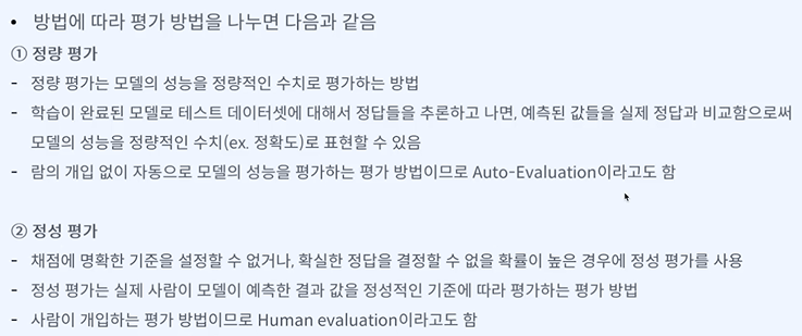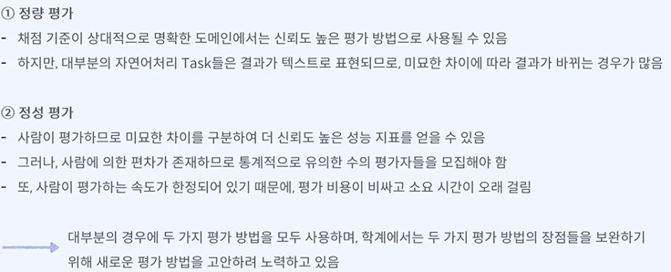 대부분의 자연어 처리는 text이므로 명확하게 채점할 수 없기 때문에 정성평가를 진행할 경우가 많다.