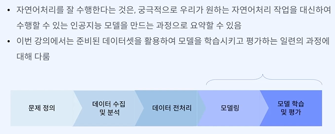 목표 - 자연어 처리 Task를 수행하는 절차 중 모델링, 모델 학습 및 평가 과정에 대해 이해할 수 있다.