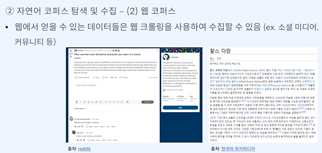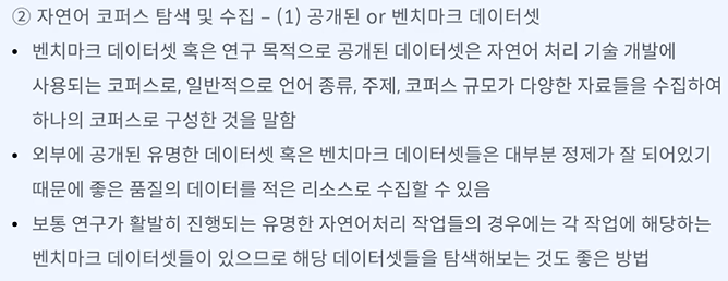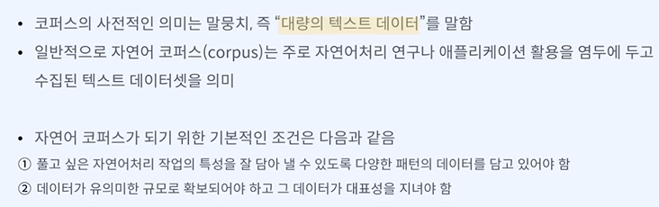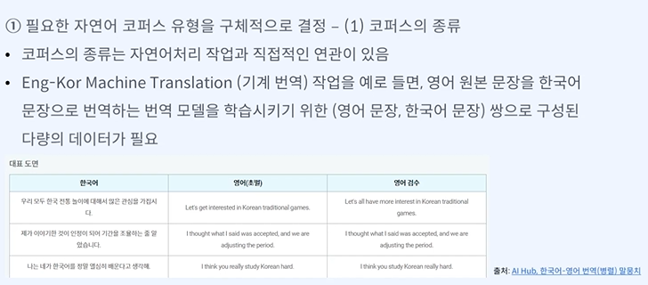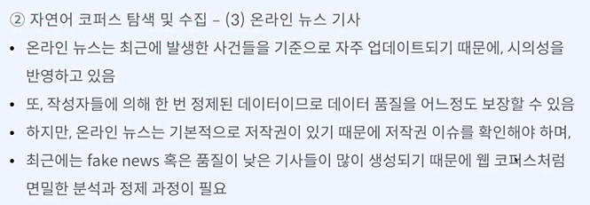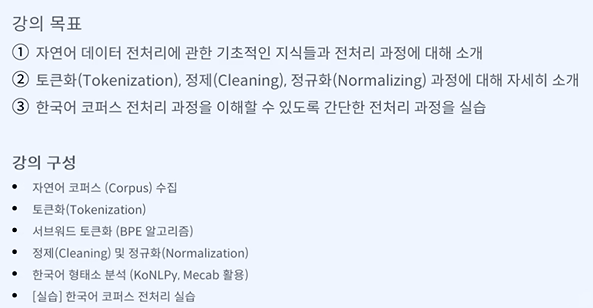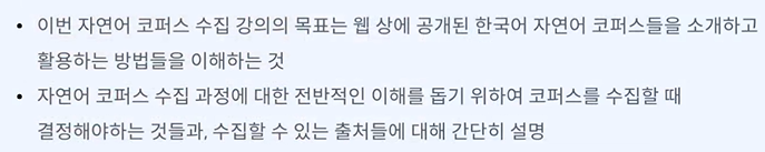 강의 목표 : 웹 상에 공개된 한국어 자연어 코퍼스들을 소개하고 활용하는 방법들을 이해할 수 있다.