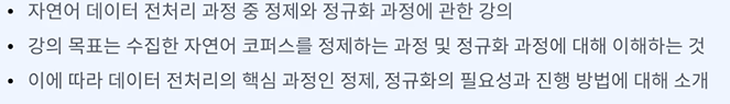 목표 - 수집한 자연어 코퍼스를 정제하는 과정 및 정규화 과정에 대해 이해할 수 있다.