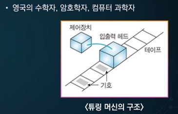 튜링 머신 - CPU + 메모리 + 프로그램 구조 = 폰 노이만 컴퓨터 구조의 기반 -> 튜링 == 컴퓨터의 아버지