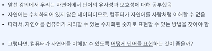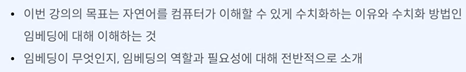 목표 - 자연어를 컴퓨터가 이해할 수 있게 수치화하는 이유와 수치화의 방식인 임베딩을 이해하기