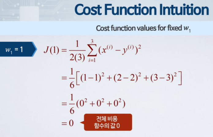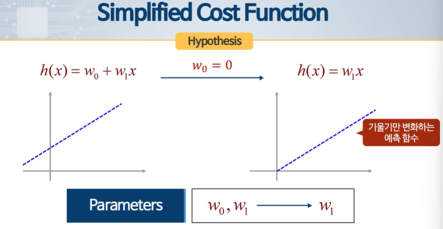 비용함수를 쉽게 만들기 위해 w0를 없앤다.