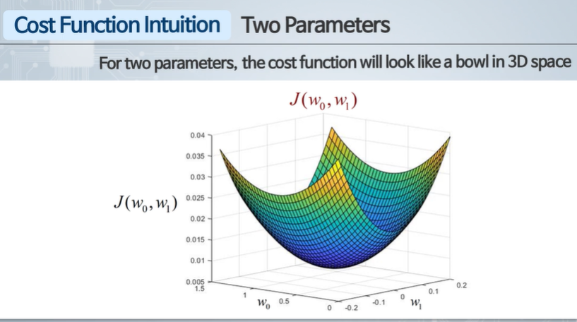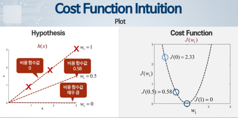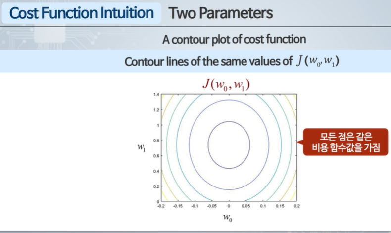 비용함수 최적화는 즉 이 J를 최소화 시키기 위해 움직인다.