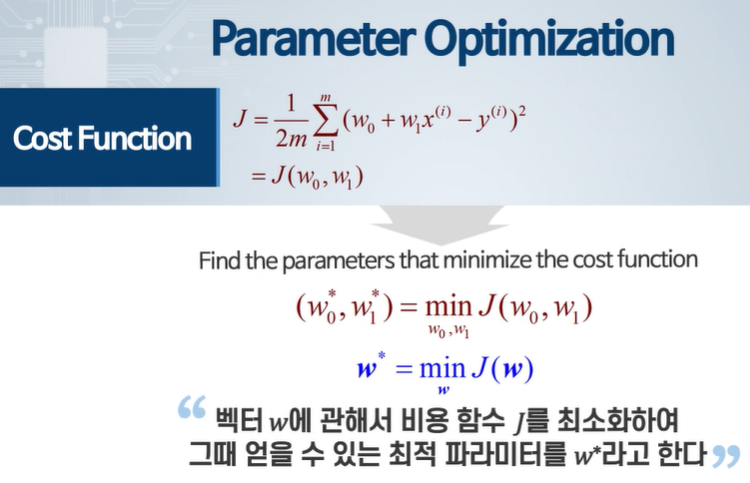 비용 함수값이 최소화되는 파라미터 값을 찾는 것이 목적이다.