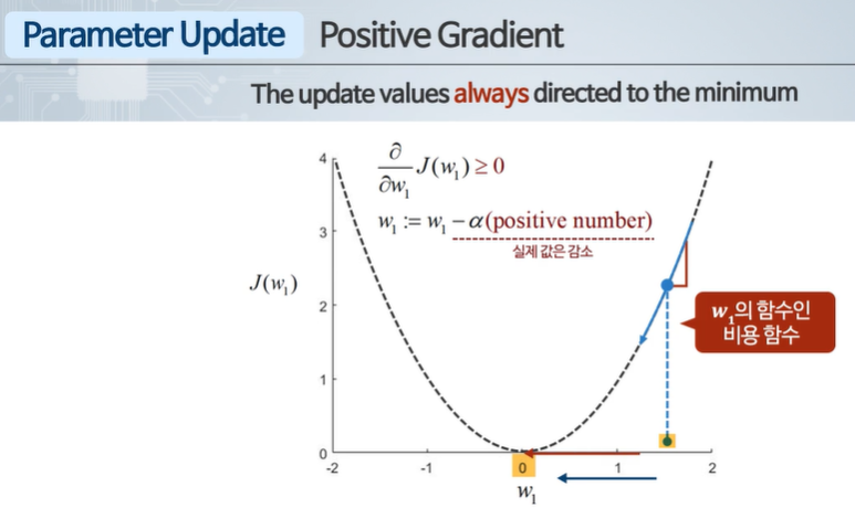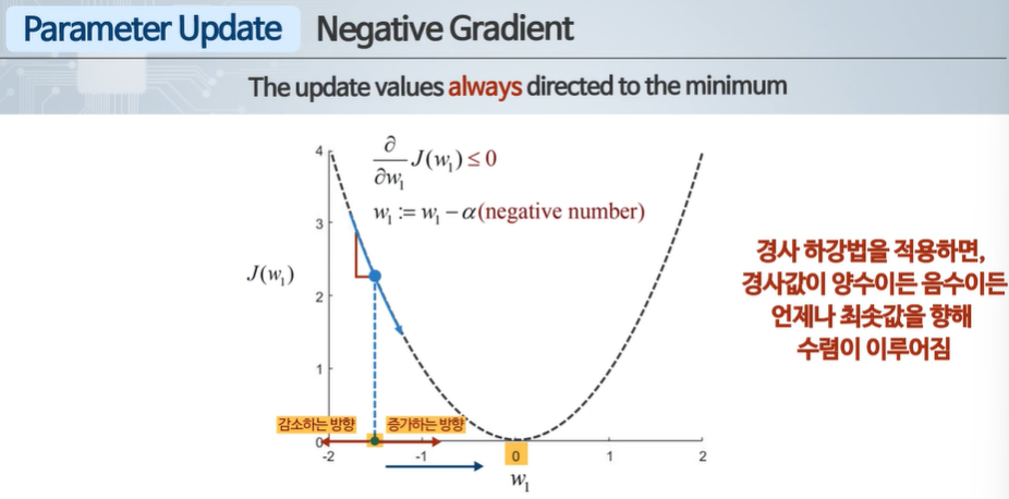 경사 하강법 - 단계적으로 최솟값에 다가가기 위해 기울기 미분값을 빼는 방식으로 업데이트