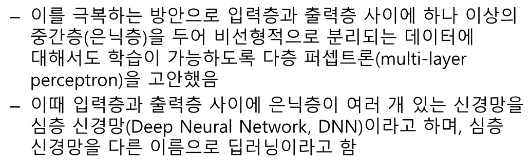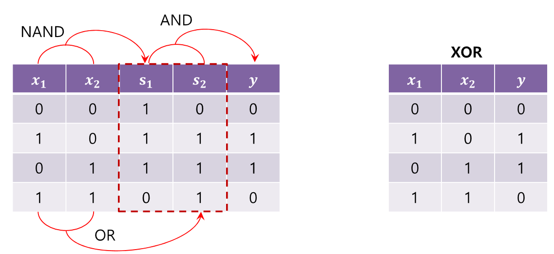 인공신경망 하나로는 XOR 게이트를 표현할 수 없는 문제가 생겼다.