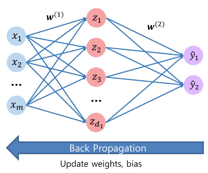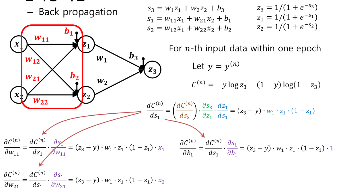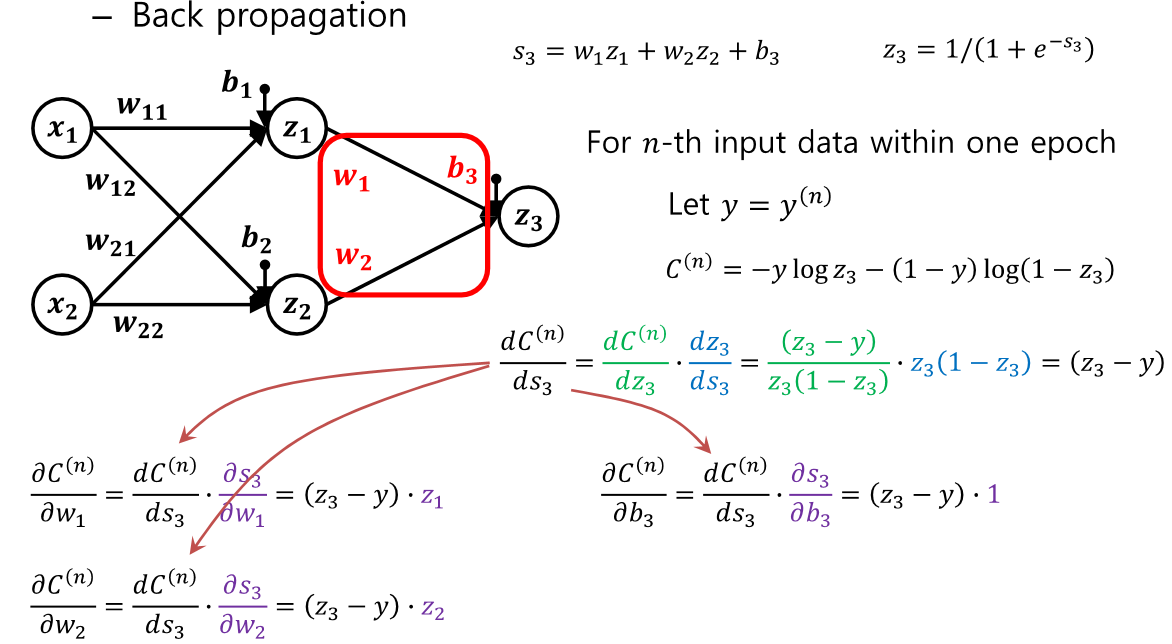 역전파 과정이다. 결국 마지막엔 (z3 - y)만 남은것을 볼 수 있다.