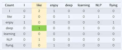 (중심)like 전체 등장 횟수중 (주변)deep과 등장한 횟수으로 1/3으로 봐서 동시 등장한 확률을 볼 수 있다.