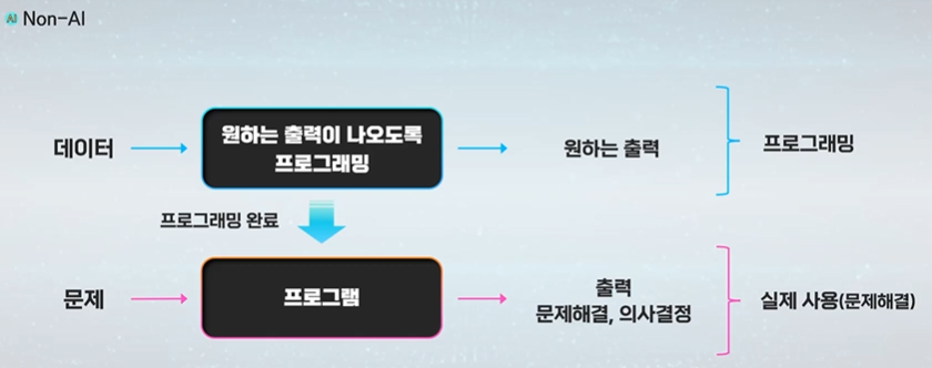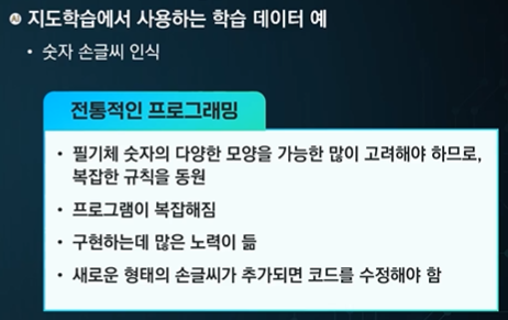 전통적 프로그래밍 - 다양한 예시를 포함해서 구분하는 복잡한 로직을 만들어야 된다. -> 코딩으로 구현하는데 많은 노력이 든다. 새로운 데이터가 추가되면 코드도 다 수정해야 된다.