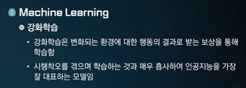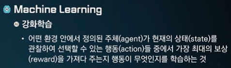 reinforcement learning - 강화학습 -> 액션에 대한 보상 시스템으로 학습한다. -> 의사 결정을 위한 최적의 액션을 선택