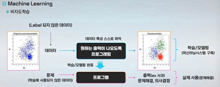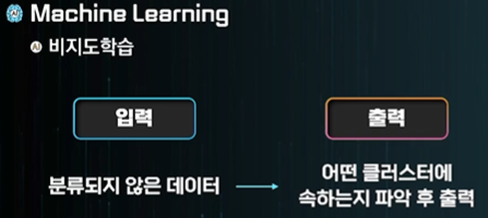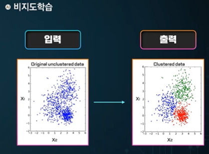 unsupervised learning - 비지도 학습 -> 레이블이 없다. -> 알아서 구별한다.