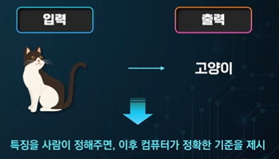 머신러닝 - 받은 데이터를 출력으로 뽑기 위해 사람이 피쳐를 뽑으면 컴퓨터가 알아서 처리하여 출력한다.