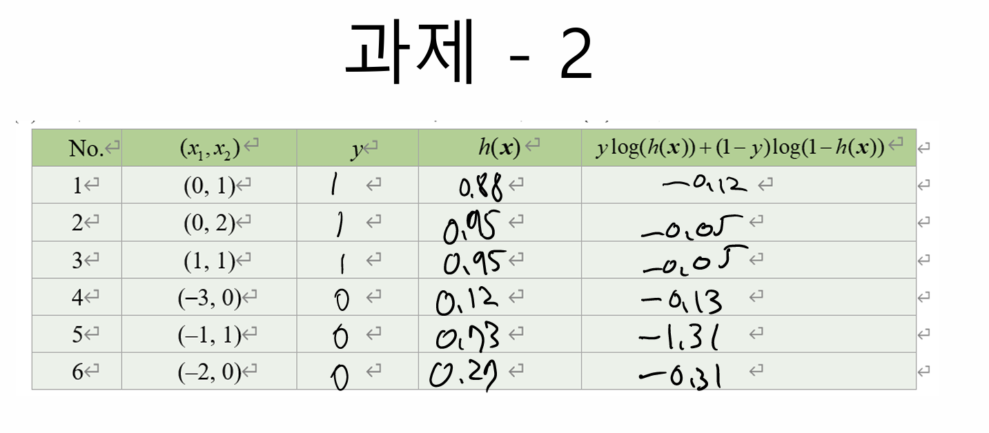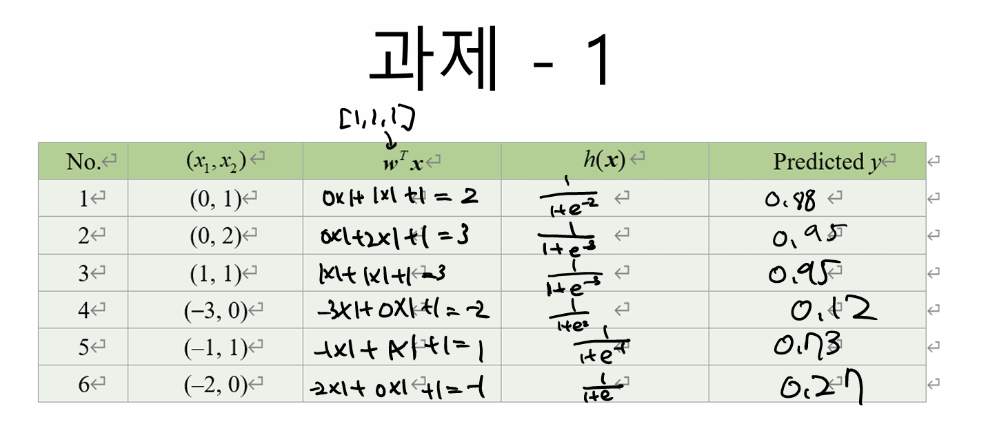 으로 하였을 때, 로지스틱 회귀의 hypothesis 함수를 수식으로 표현하고, 다음 표의 빈칸을 채워 완성하시오: