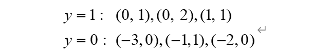 2차원 특징 공간 상에서 다음과 같이 2개의 부류 (y = 1, y = 0)에 속하는 6개의 데이터들이 주어졌을 때,