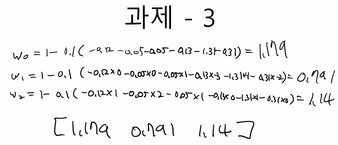 로 하고, 경사하강법을 이용하여 파라미터를 한 사이클 업데이트 시키고, 업데이트 된 파라미터 벡터 값을 구하시오.