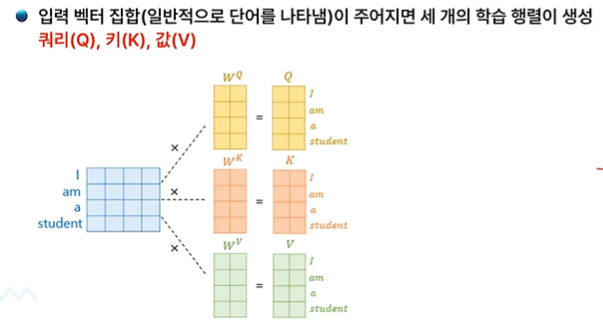 - 키(Key): 쿼리와 비교 대상이 되는 다른 단어들입니다. 예를 들어, "The", "cat", "on", "the", "mat"이 키가 됩니다.