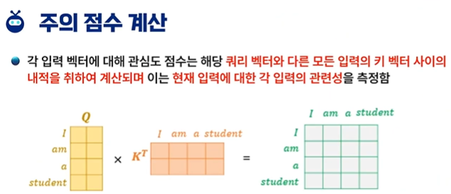 - 쿼리("sat")는 문장의 모든 단어(키)와 비교됩니다. 이 때, 각 단어가 "sat"와 얼마나 관련이 있는지를 평가합니다.
