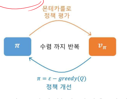 2. v 대신에 액션가치 함수 q를 이용한다. => MC를 통해 q를 구하여 새로운 그리디 정책을 만든다.