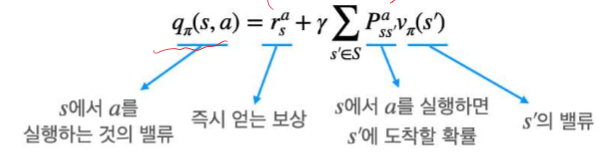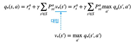 최적 밸류 = 최고 값의 상태 가치 함수 v, 액션 가치 함수 q -> 최적 정책을 따를 때 보상의 총합이 가장 크다. -> 최적 정책을 따르면 최고 값의 상태 가치 함수, 액션 가치 함수를 얻을 수 있다.