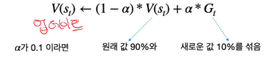 Temporal Difference 학습 == TD => 에피소드가 끝나지 않아도 계산할 수 있다.