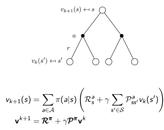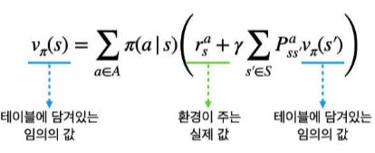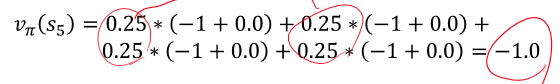 그리드 월드에서 4방향을 다 갈 수 있다고 하면 4방향의 테이블의 가치v가 확률 p에 곱해지고(그리드 월드라면 보통 1이다.), 감쇠인자에 곱해져서 보상과 더한 뒤 또 4방향이므로 정책의 0.25를 곱해서 나오게 된다.
