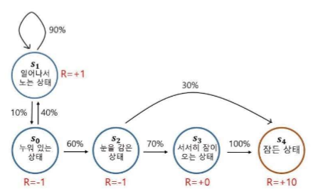 마르코프 리워드 프로세스 == MRP = MP에 보상(R)의 개념이 추가되었다.