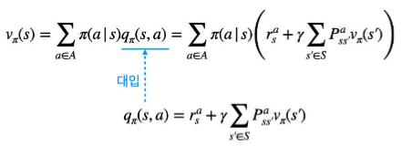 벨만 방정식 = 시점 t와 t+1사이의 벨류의 관계 및 가치 함수와 정책 함수 사이의 관계도 다룬다.