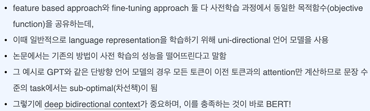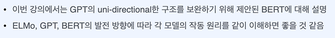 문장단위의 task를 고려할 때 뒤에서 앞으로도 앞에서 뒤로도 봐야하는데 단방향인 GPT는 부족하므로 양방향이 필요하다.