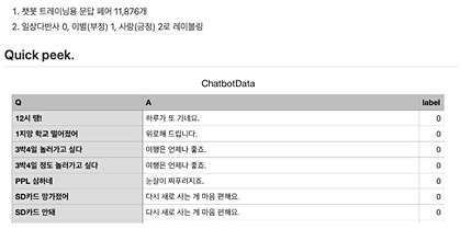 오늘 실습에서는 일상 대화 챗봇 구현에 많이 사용되는 Chatbot_data를 사용하겠습니다.