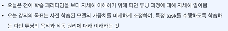 목표 - 사전 학습된 모델의 가중치를 미세하게 조정하여, 특정 task를 수행하도록 학습하는 파인 튜닝의 목적과 작동 원리에 대해 이해할 수 있다.