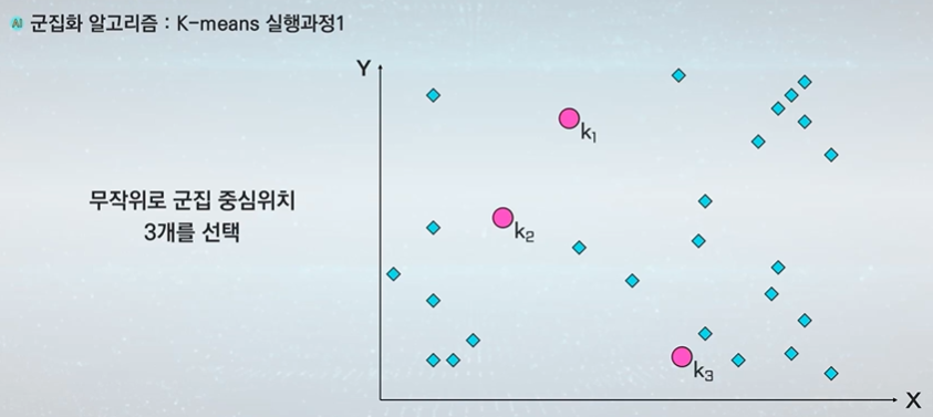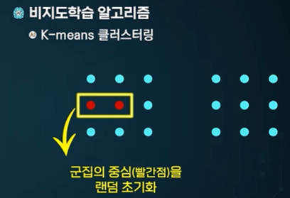 파란점 18개를 2개의 클러스터로 묶는 프로세스를 진행할 것이다 -> 2개의 클러스터 중심점