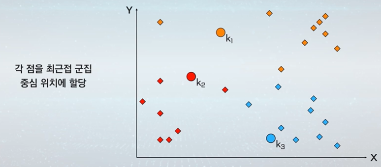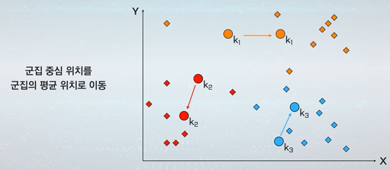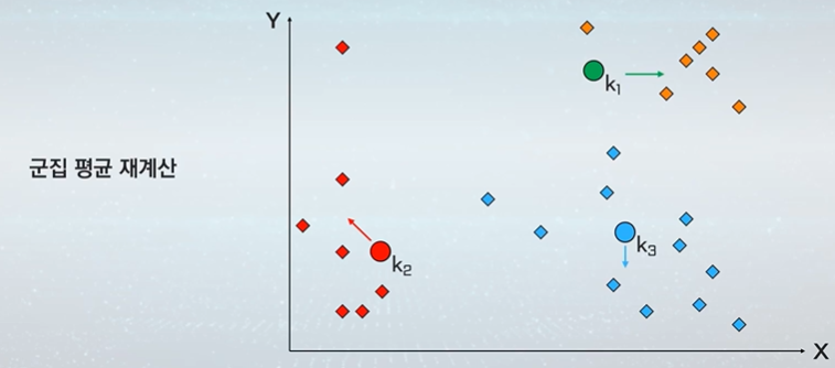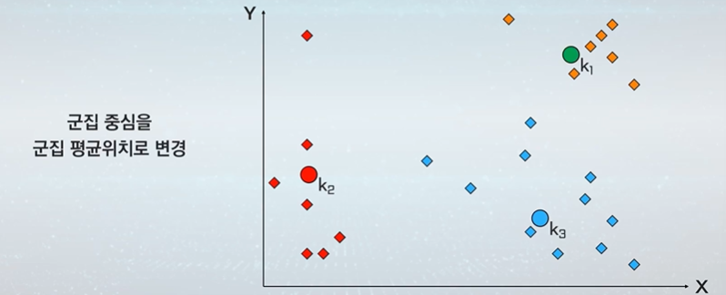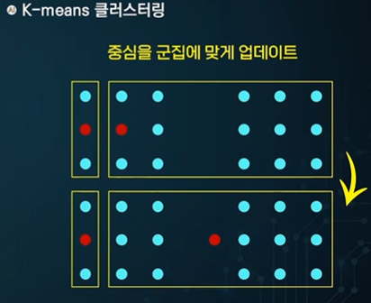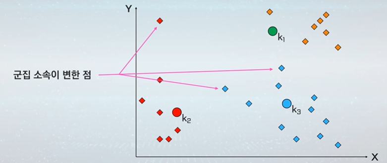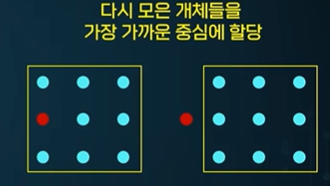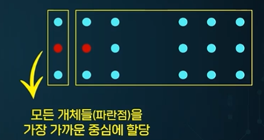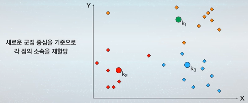 다시 가장 가까운 중심점에 할당한다. -> 또 군집에 맞게 중심 옮기기