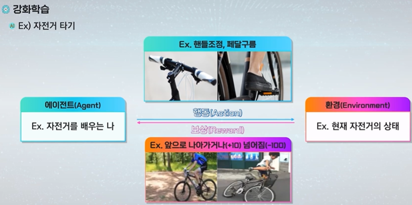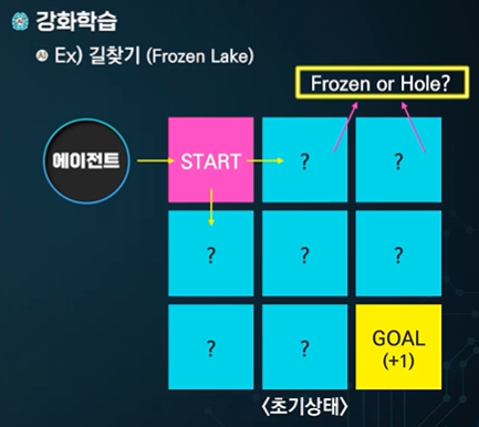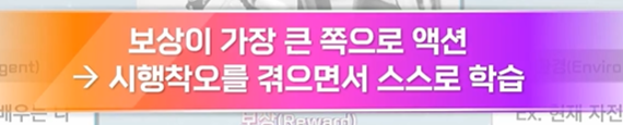 처음부터 어떻게 될 지 모른다. -> 여러가지 시도(액션)를 하게 된다. -> 보상이 쌓인다. -> 최적의 액션을 하도록(정책) 만든다.
