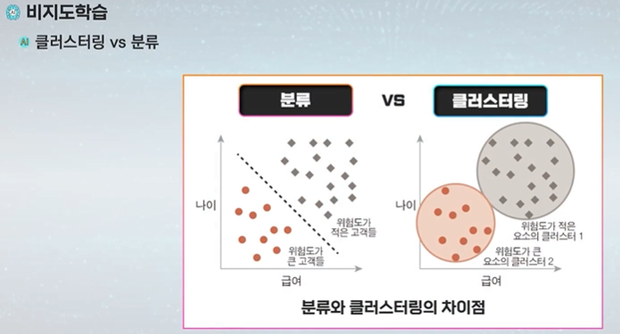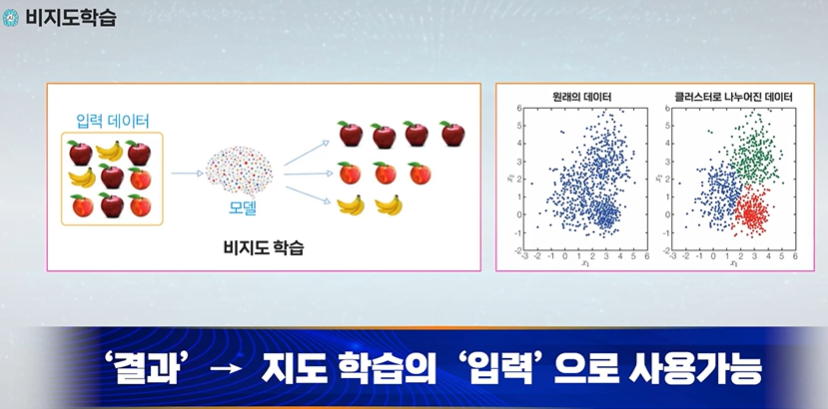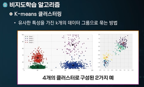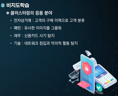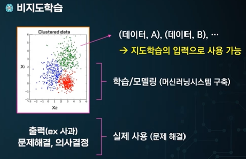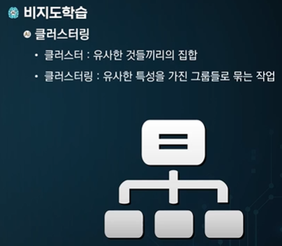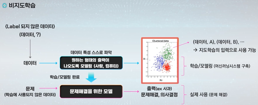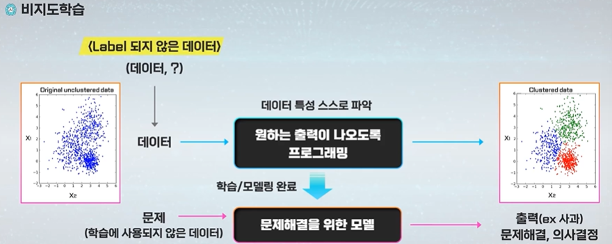 레이블이 없는 단순 데이터를 특징 끼리 묶어서 레이블을 만든다. 특정 기준을 만들거나 피쳐를 사람이 제공해 주면 컴퓨터가 클러스터를 만든다.