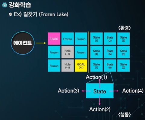 보상 - 값으로 주어진다. 의도한 행동이라면 +, 내가 원하지 않은 점수면 -