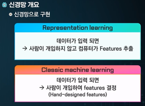 데이터를 그대로 입력해서 출력을 얻는 것 - 표현학습 == 신경망으로 구현한다.