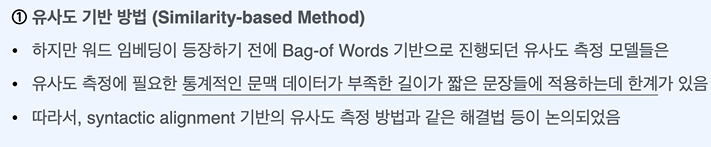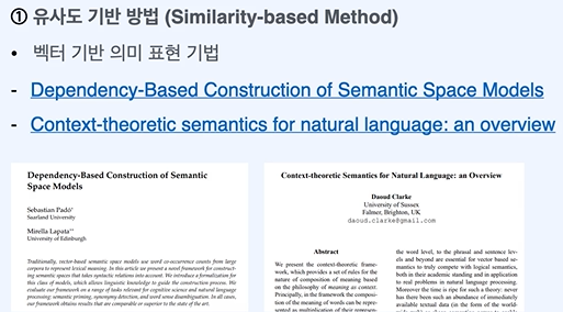 백터 기반의 의미 공간을 만들기 위해 큰 언어 코퍼스를 사용하여 언어의 유사도 구분 가능 -> 통계기반