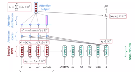 디코더의 시작값과 인코더 모든 값을 내적하면 인코더 인풋 개수만큼 스칼라 값이 나온다. -> soft max를 취하면 1이 되면 확률 분포가 나온다. = attention distribution을 얻는다. 유사도를 얻게 된다-> 나온 값을 weight와 곱해서 attention hidden state를 얻는다. 디코더 시작 값과 attention hidden state를 concat 하여 결과로 사용한다.