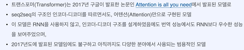 seq2seq - RNN기반 모델 = vanishing gradient problem, 고정된 벡터에 모든 정보 압축하다 보니 정보 손실 발생