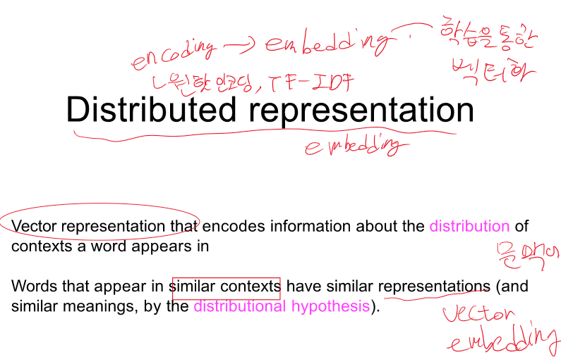 문맥에 대한 분포 - 단어와 주변 단어