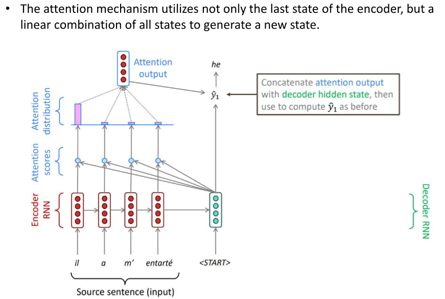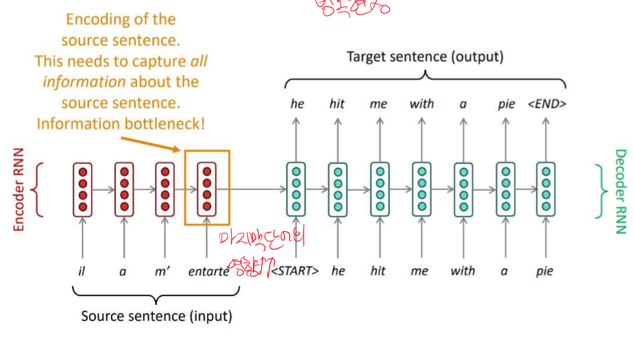 RNN - 인코더와 디코더로 구성되어 있다. 인코더 인풋 - 번역해야될 문장 디코더 출력 - 번역 된 문장 입력이 들어갈 수록 정보가 사라져서 마지막 입력의 영향이 커지게 된다. -> 정보 병목 현상 ->