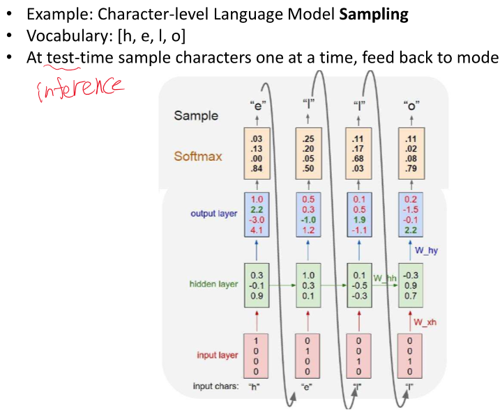 여기서 Whh, Wxh, Wyh 등 모든 파라미터는 이전 에 사용했던 것과 동일하다.