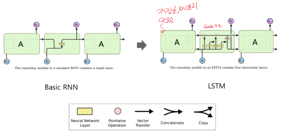 기본적인 RNN(Recurrent Neural Network) 구조에서는 시간에 따라 입력되는 다양한 시점의 데이터를 처리할 때, 모든 시점에서 같은 파라미터(가중치)를 공유합니다. 이는 RNN의 핵심 특징 중 하나로, 시간적으로 연속적인 데이터를 처리할 수 있게 해줍니다.