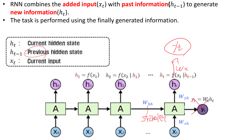 2. **은닉 상태 가중치(W<sub>h</sub>):** 이전 시점의 은닉 상태(출력)를 현재 시점의 은닉 상태 계산에 사용하는 가중치입니다.