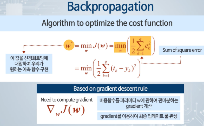 - 다층신경망의 비용함수는 예측오차의 제곱의 합으로 정의될 수 있다.
