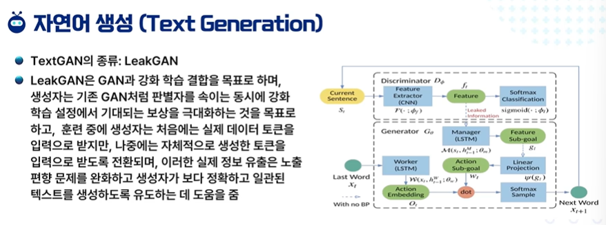 - LeakGAN은 생성적 적대 신경망(GAN)과 강화학습을 결합한 모델입니다. 이 모델에서 생성자는 기존 GAN의 목적인 판별자를 속이는 것뿐만 아니라, 강화학습을 통해 보상을 극대화하면서 보다 효과적인 학습을 추구합니다. 이로써 생성자는 효과적으로 문맥에 적합하고 일관성 있는 데이터를 생성하도록 훈련됩니다.